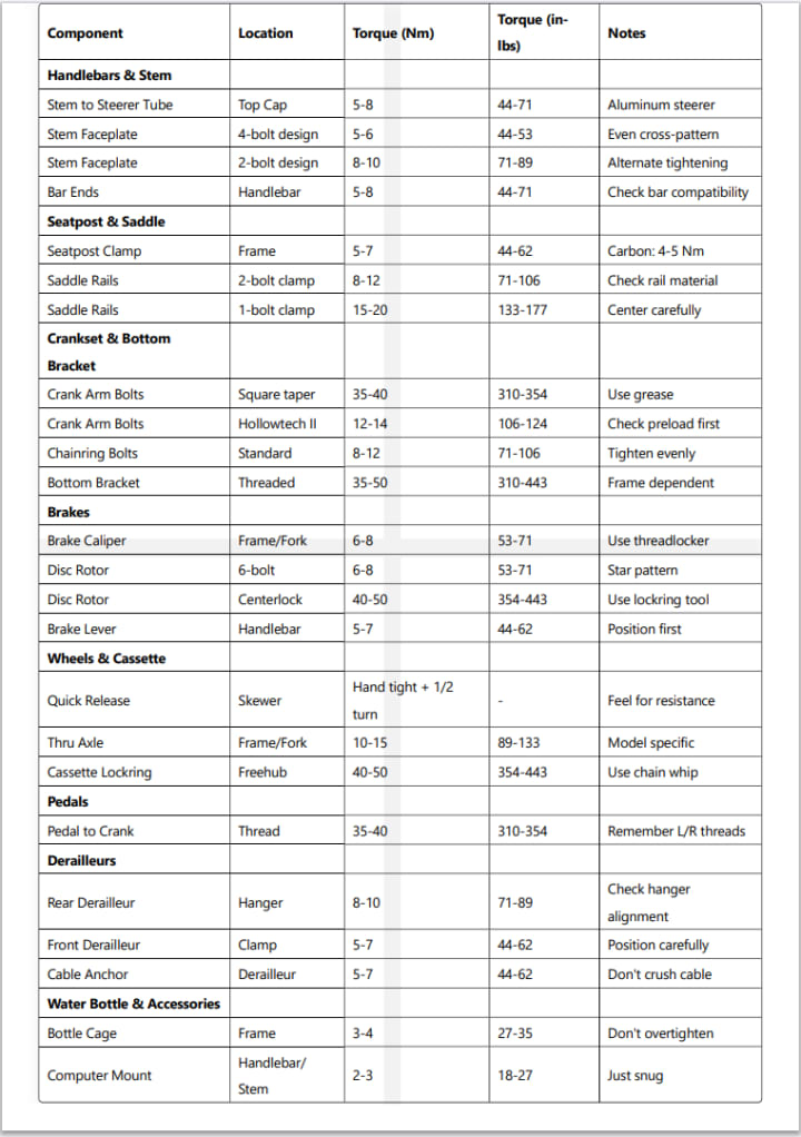 By following these torque specifications and best practices, you'll ensure your bicycle performs optimally while maximizing component lifespan and maintaining safety on every ride.